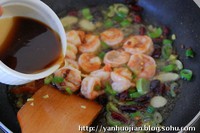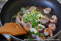 7.炒至虾仁断生时,放入葱姜蒜快速翻炒