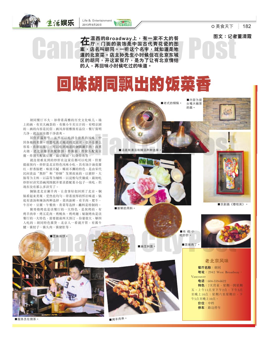 居住在温哥华,虽然可以吃到全世界的风味,中国各地的美食,但想吃真正地道的北京菜,也不是那么容易。在胡同餐厅,可以吃到地道的铜锅涮羊肉、卤煮火烧、老北京爆羊肉配烧饼、炸酱面、炸窝头配臭豆腐、炸馒头配酱豆腐、扁豆焖面、红烧带鱼等。
