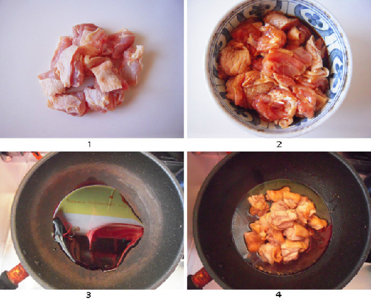 做法:1.将鸡腿去骨,切成边长3cm的见方块儿。