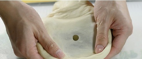 继续搅拌,到面团能形成坚韧的很薄的薄膜,用手捅不易破裂,即使捅破后破口因为张力也会呈现光滑的圆圈形。这个时候的面团就达到了完全阶段。