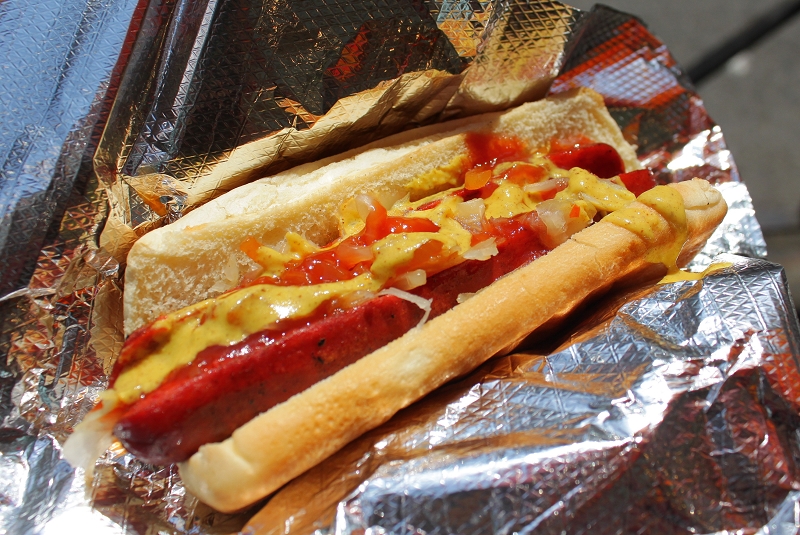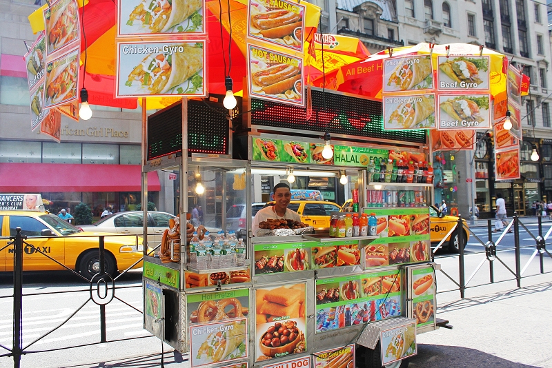 在纽约的闹区大街小巷都是摊贩,尤其是第五大道,没几步就是一家卖热狗、现榨果汁和冰淇淋车,相当热闹。
