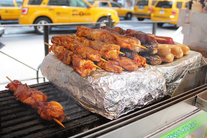 虽然傻眼,但心想可能纽约物价真的比较高吧,也就没说什么。没想到后来逛街口渴,去临近的摊贩买饮料时,顺便问了热狗的价格。一问不得了,得知这里摊贩热狗定价是$4上下,肉串是$5。