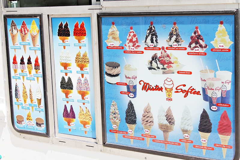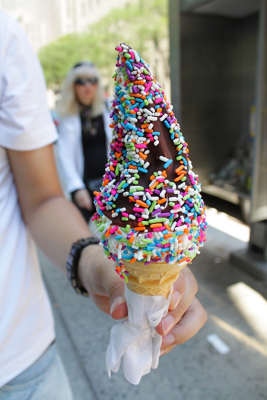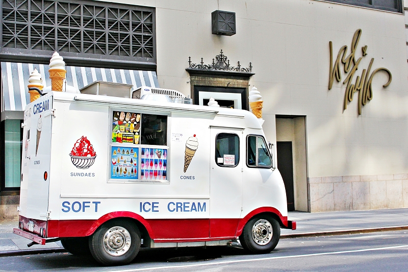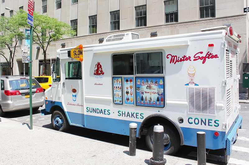 来纽约的路上,沿途看到好几台冰淇淋车,这车子的样貌,好似去年在香港看到的富豪雪糕车。有些冰淇淋车停在路边时,会放着轻松愉快的曲调,就好像是叫大家快来品尝阿~
