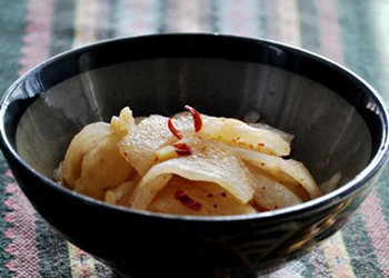 原料:萝卜、辣椒粉、姜末、辣椒油、山西饺子醋、盐、木糖醇。