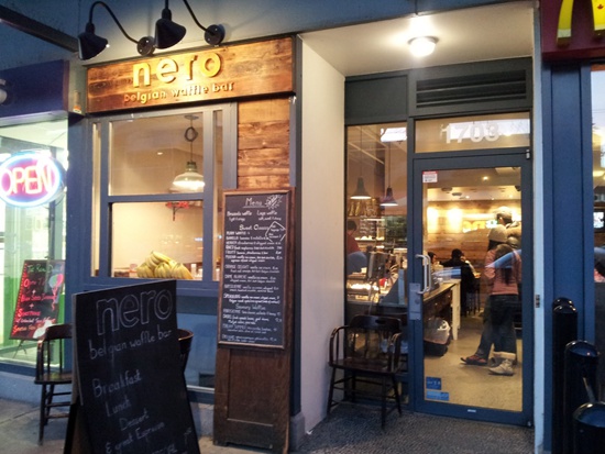 这家专门提供比利时华夫饼的甜品店,就位落在繁华的Robson大街上,小小的一家店,朴素的欧洲小店风格,古色古香。满屋的华夫饼香甜气息,是一种很温馨很温暖的香。华夫饼,Waffle,又称窝夫,松饼,棋格饼,压花蛋饼……源于比利时,制作方法简单,也很百搭。它可以加各种新鲜蔬果和沙拉酱或奶油,也可以涂上你喜爱的各种酱料、沙拉,水果,没什么严格的讲究,一切都很随意。Nero Belgian主要提供Brussels和Liege这两种格子饼。Liege是香脆口感,面积较小的圆形格子饼。Brussels是口感松软,长方形面积较大的格子饼。格子饼口味也分成甜味和咸味两种,至于哪种好吃,那就是见仁见智的事情了。