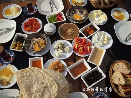 16、土耳其:传统的早餐包括面包、奶酪、奶油、橄榄、鸡蛋、西红柿、黄瓜、果酱、蜂蜜、硬奶油和土耳其茶,常还有一种名叫sucuk的辣味土耳其香肠。(个人觉得看着很多,但实际上我敢下口的只有面包、西红柿、黄瓜和橄榄,汗)