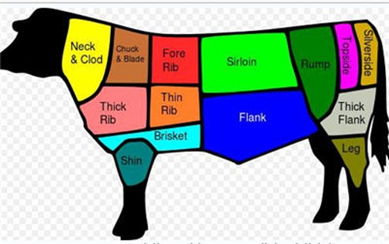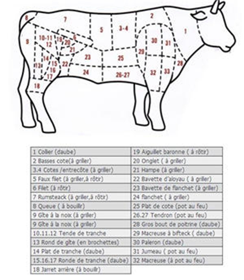 法国人虽然没有西班牙人对牛如此有感情把牛当成国家图腾(法兰西喜欢大公鸡 + +), 但是对于个个吃货的法国来说牛排和牛肉简直就是人生活下去的动力之一。所以在吃牛上法国的讲究都是世界牛肉研究的领头羊。在做牛排这事上还是得看法国人的,所以基本牛肉在牛身上的位置专业单词都是法语基础,英语的单词都是直接引用法语词汇换成英语发音而已。下文有些专业单词就直接用法语写了。