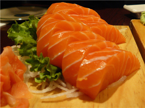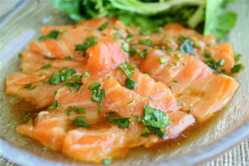 * 新鲜的三文鱼鱼肉呈橙红色且色泽鲜明,肉质坚挺鱼皮光滑,脂肪分布俨如大理石并具有清晰可见的白色条纹,经指尖挤压后会迅速反弹。