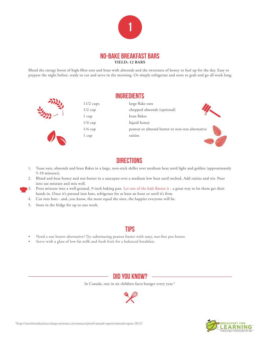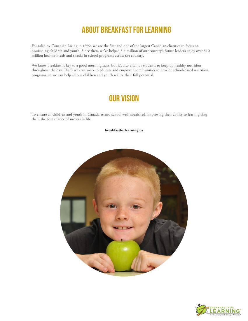 加拿大慈善组织Breakfast for Learning表示,调查发现,本国超过3成小学生及超过6成中学生,于上学前没有进食富营养的早餐。有研究指出,进食了营养丰富早餐的学生,在学校的学习表现会较优胜,包括有更好的记忆力、解决问题技巧、说话流利、具创作力、精神集中等。饿着上学的学生,不单阻碍学习进度,更影响自尊、缺乏精力。