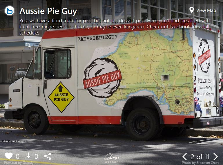 顾名思义,这家移动餐车是专门卖澳洲馅饼的,但是不仅仅是一般大众所钟爱的甜点馅饼哦!除了那些好吃的水果口味的甜点馅饼,该餐车还提供各种肉食馅饼,如牛肉、鸡肉,甚至袋鼠肉。那些热爱澳洲馅饼的小伙伴不要错过哦。