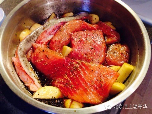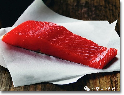 但这个季节是钓三文鱼的好时节,特别是野生的Sockeye这个品种,因肉质鲜嫩肥美,色泽鲜红绚烂,白色的脂肪分布均匀,若隐若现,呈现出动人的规则曲线,如同舒缓的波涛撩拨你的心弦。任何美味的调料都显多余,只需一点青芥就能将Sockeye的鲜美完整得呈现出来。不能多写了,手边没有切出来的鲜肉啊!