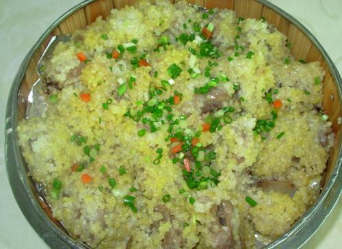 7、再倒入小米排骨,上笼蒸40分钟左右即可。