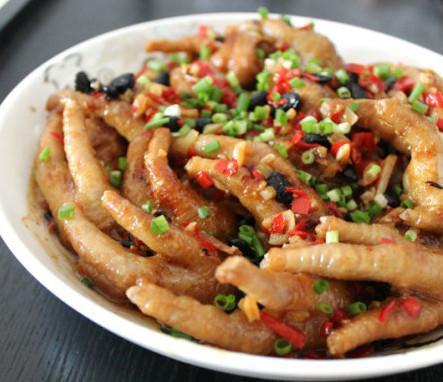 3、捞出凤爪加盐、胡椒、葱、红椒、大蒜末、豆豉、生粉、料酒、香油、生抽、老抽、蚝油充分抓匀;