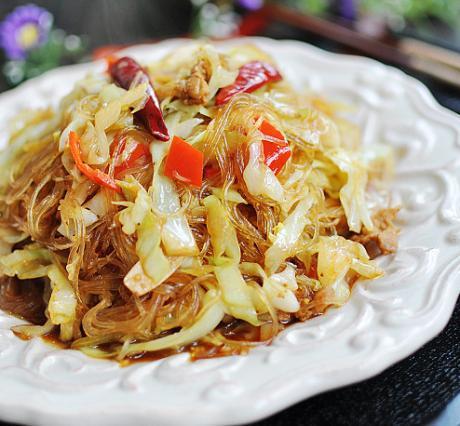 4、当变软出水时,下粉丝翻炒,放盐,让粉丝充分吸收炒出的水分;
