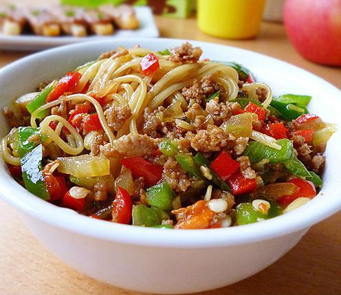 5、加入青椒块翻炒,加少许老抽,炒至青椒断生,放少许盐,淋少许香油即可。