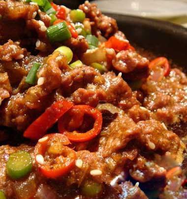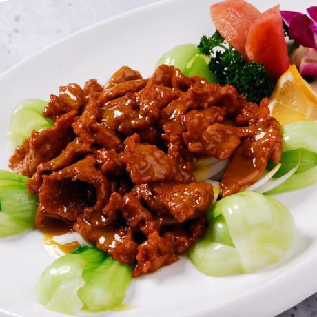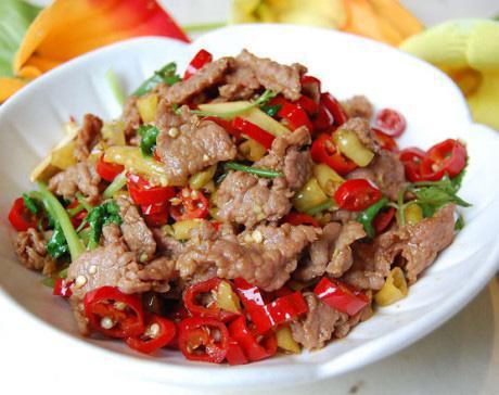 3、下油适量,趁油未热放入牛肉旺火翻炒,烧至六成熟时,把火关小,加盖焖至熟透。这样炒出的牛肉既鲜美又嫩滑。