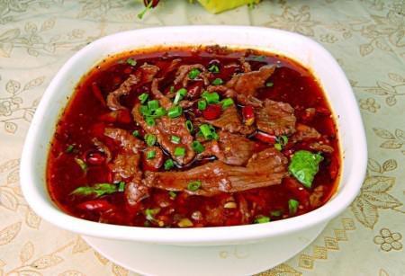 4、将干辣椒炸香制成椒油,倒入牛肉碗中即成。