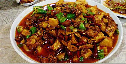 4、大火烧热油,放入姜、蒜片爆香,放入辣椒花椒,放入炸好的鸡块翻炒,撒入鸡精白糖和葱段炒匀。