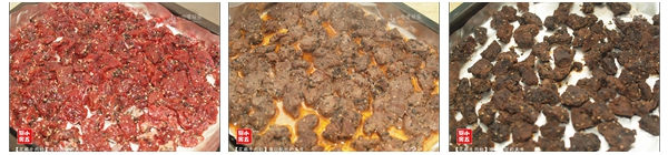 两斤牛肉,40升烤箱自带的烤盘烤了两次。喜欢吃干一点的牛肉粒,烤的时间可以适当延长一些,烤得越干的牛肉粒,存放的时间越长。