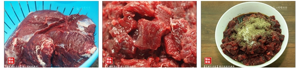 【食材】牛肉1000g、生抽60g、黄酒30 g、盐6g、白糖10g、黑胡椒粉6g、黑芝麻30g
