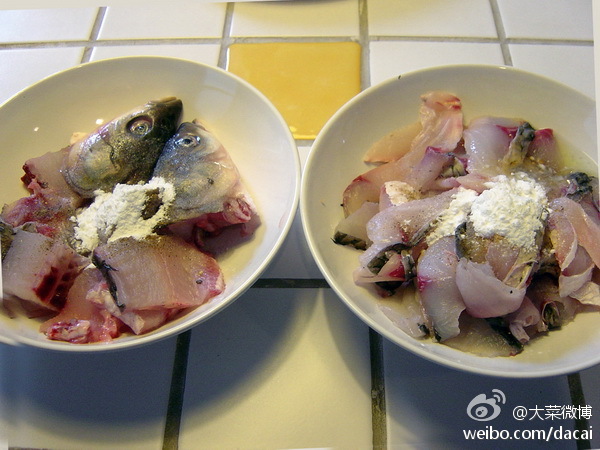 4,将鱼片和鱼排鱼头分别用1茶匙料酒、2茶匙淀粉和1/2个蛋清和适量的盐抓匀,腌制15分钟。适合制作水煮鱼、酸菜鱼等菜。