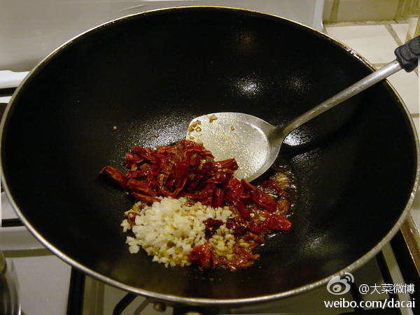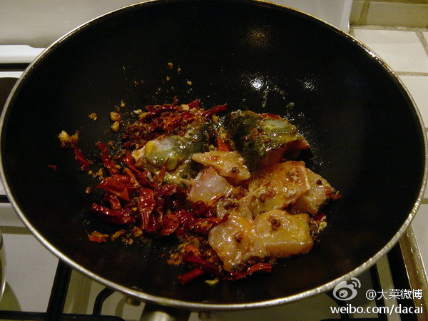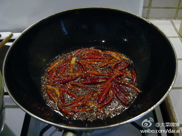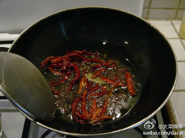 11、锅洗净,将剩余的五香油倒入,烧至5成热,放入剩余的干辣椒段和花椒,用小火将辣椒和花椒的香味炸出来,注意不要炸糊了,辣椒的颜色稍变就关火。
