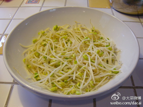4、 豆芽洗净去根须,放入沸水中煮断生,铺在大盆底部。