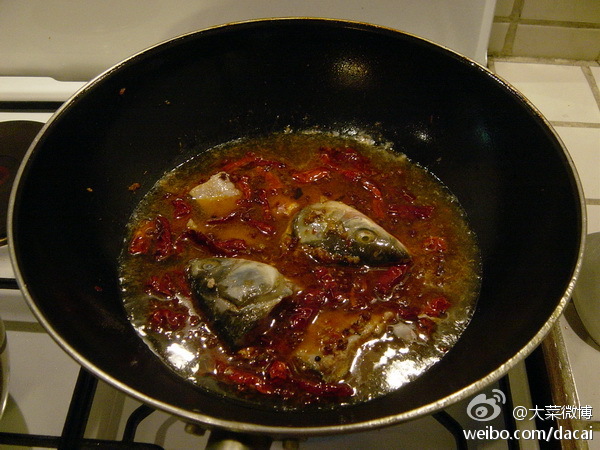 8、加入鱼头和鱼排炒匀。加入酱油、料酒、糖、胡椒粉一起炒。