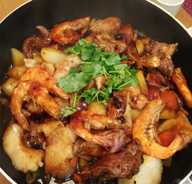 我们点的是梭边鱼滋补锅加鲜虾组合,服务生首先在锅底刷一层薄薄的油,然后铺放上洋葱、红萝卜、地瓜、蒜头等蔬菜。再把点的食材铺在蔬菜上,盖上锅盖。等鱼肉变成白色,虾渐渐变红,约是七八分熟的程度,再把超浓稠的秘制特调酱汁淋在食材上继续煮,再过三至五分钟,把香菜、泡饼放上,就可以开筷了!