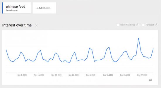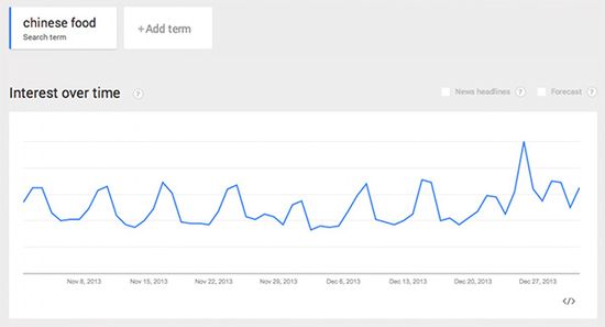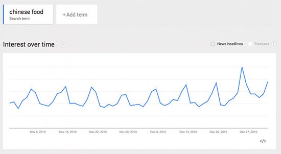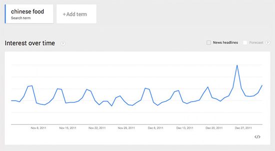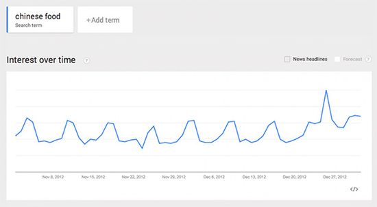 据《华盛顿邮报》网站报道,这一习惯已经逐渐演变成全国性的仪式。不仅民间传说,一些数据也能说明问题。根据谷歌的搜索趋势显示:每一年的圣诞,人们对中国食物的兴趣都会呈现爆炸式的增长。在谷歌上,全年中,没有哪一天 “中国食物”的搜索数量能赶得上圣诞节。