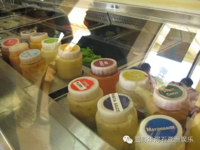 清淡低脂蛋黄酱Light Mayonnaise、芥末Mustard、甜味的烤肉酱BBQ Sauce、意大利沙拉酱Italian Dressing、蛋黄酱Mayonnaise、乡村沙拉醬Ranch、由蛋黄酱、芥末、萊姆汁和大蒜等调制成的ChipotleSouthwest Sauce、棕色芥末Brown Mustard、蜂蜜芥末Honey Mustard、甜洋葱酱Sweet Onion Sauce(推荐这个)、醋Vinegar、牛肉味沙司酱Buffalo Sauce等。
