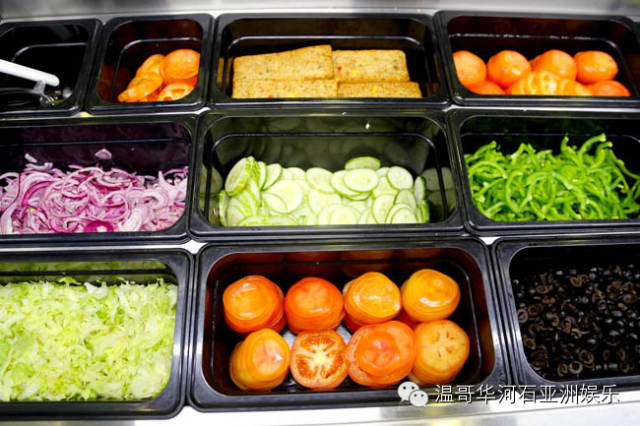 蔬菜有:洋葱Onion、生菜Lettuce、西红柿Tomato、黄瓜Cucumber、青椒GreenPepper、小黄瓜Pickles、橄榄Olives、香蕉胡椒BananaPeppers、盐Salt、胡椒Pepper、墨西哥辣椒JalapenoPeppers、意大利香料Oregano、切碎的胡萝卜ShreddedCarrots等。