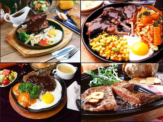 2.如汤汁或蘸料和主料是分开的,或是后浇在主菜上的,则用with连接。