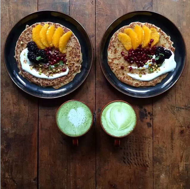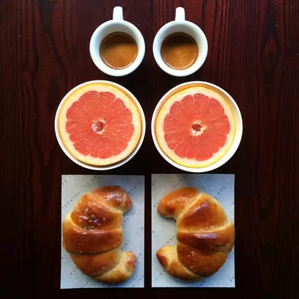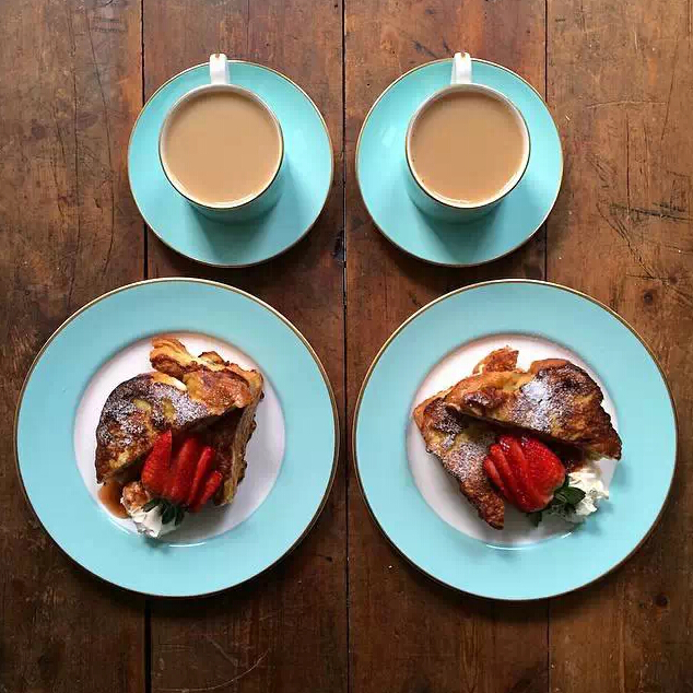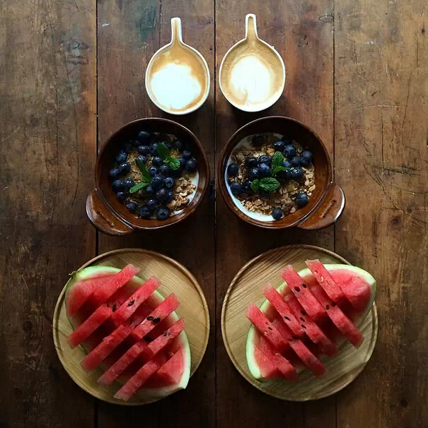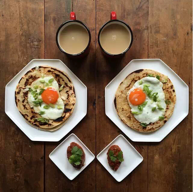 那一天,他准备了西式煎蛋饼,配牛油果、意大利香肠及果汁,结果随手摆放完之后却发现两份早餐竟然是完全对称的,所以便拍了照片分享到网络上,朋友的好评让他们萌生了继续分享下去的念头。