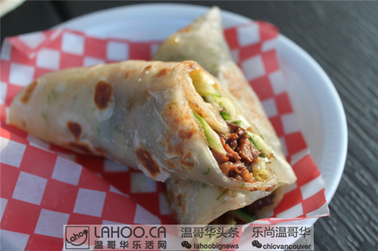 Miandao Chinese Food除了牛肉汉堡之外,牛肉卷也很不错,薄薄的海鲜煎饼,再加上牛肉切片、黄瓜、大葱,均匀卷在一起。方便携带,可以拿在手上一边吃一边逛夜市。