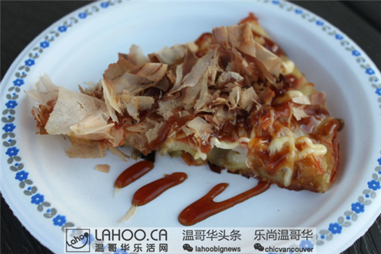 Seoulful摊位上的韩式海鲜煎饼,有虾和蟹肉,煎到脆脆的,再淋上甜酱、蛋黄酱、和柴鱼片。这家摊位上还有全素面食哦!