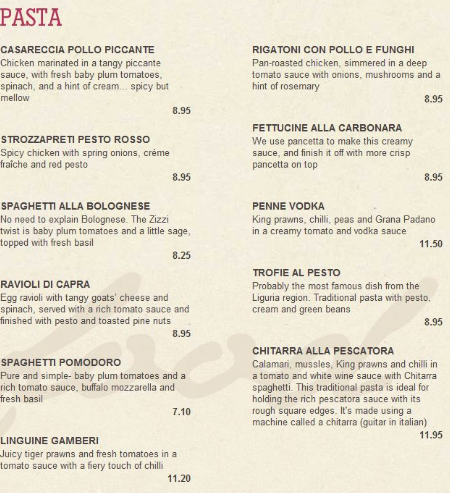 Lizzie是英国比较有名的意大利菜连锁店,咱们就借用它的Pasta菜单来作例子,带着大家过一次,就能明白了。
