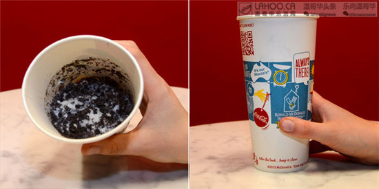 点一个香草味奶昔(Vanilla Milkshake),然后让店员在杯子的底部和奶昔表面加上奥利奥碎末(这个部分麦当劳会有)。