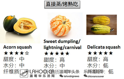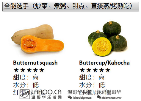 第一组是我最最推荐的全能品种,又甜又面,尤其是后者(buttercup 或者kabocha, 有时候也会写成butter bowl),用来蒸、煮、甜点、炒菜都是不二的选择!