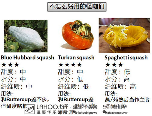 第四组是一些长相奇怪或不太好用的品种,其中spaghetti squash有时候在饭店里会看到,就是烤熟之后用叉子挂成细丝,像面条的形状所以名字才这么来的。它的味道和口感都很一般,完全没必要特意买。