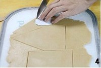 松弛好的面团,放在案板上擀成厚约0.3CM的薄面片。(如果案板不够大,可以将面团分成数小份,分次来擀)。把剪好的纸片模型放在面片上,用刀依模型的边缘切割出图案