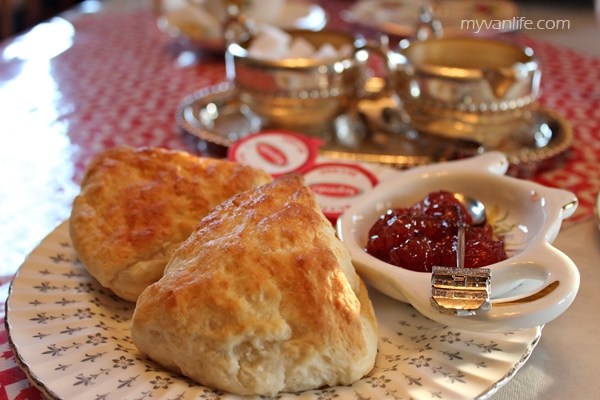 英式茶点套餐一律$12.5/人,除了名为”伦敦仕女”(London Lady)的红茶,随茶奉上的还有该农舍自己烘焙的司康、果酱和糕点。餐点贵在手工自制,谈不上特别精致;但茶具却是不马虎 – 艳色玫瑰印花骨瓷里的红茶漾著金黄,在洁白的桌布上洋溢浓浓的英伦风。