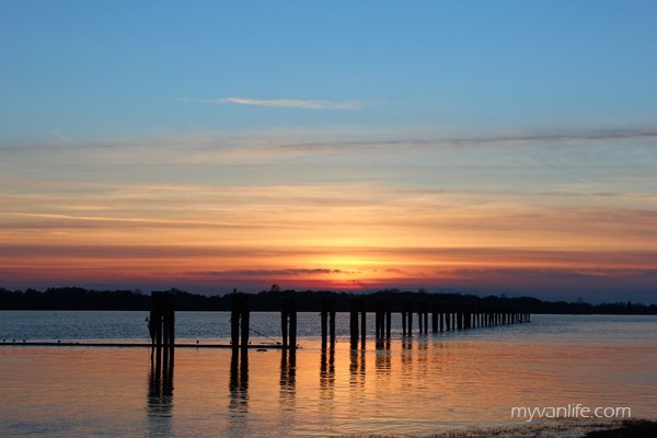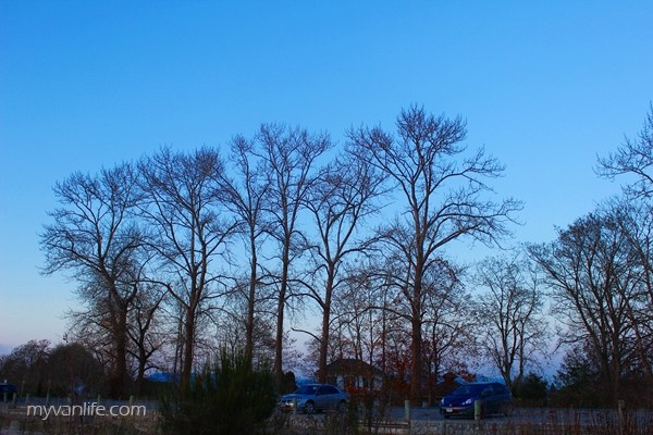 出得农庄门来,天色已暗。北国的冬季天黑得早,野鸭们三两横过高大却光秃的树梢。夕阳低矮在地平线边的暮霭,一带金黄,在犹蓝的晴空下更显耀眼。站在河岸边,刺骨的河风逼得人紧揪住领口;那抹映在水上的夕照随著水流过而细碎闪耀,河中木桩阴影拉得更长更墨了。