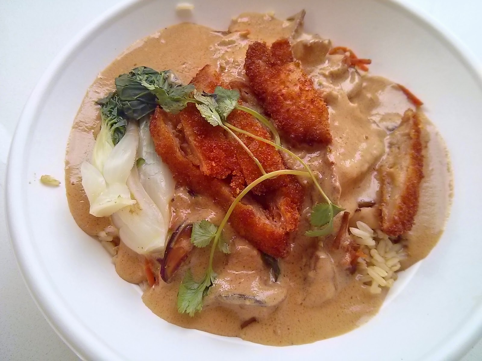 这是一个流动的美食车,提供泰式咖喱饭(Red Thai Curry Rice Bowl),米饭上面浇上咖喱鸡或者豆腐。芽菜、辣椒、胡萝卜、芝麻籽和鸡肉、米饭搭配起来,色泽非常好看,看着就很有食欲!