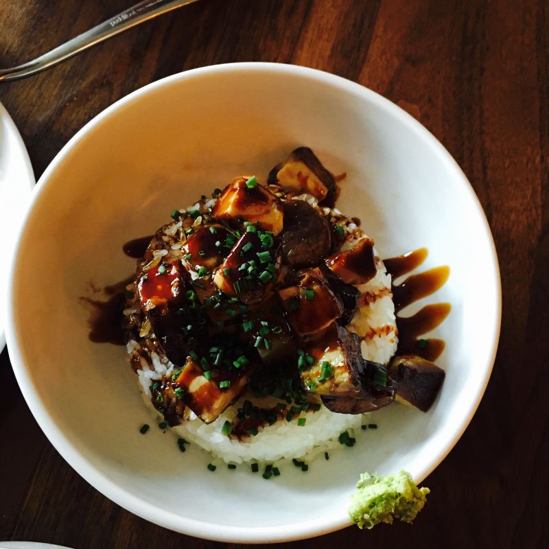 通常盖饭都是热乎乎的,而Shizen Ya却独树一格,它家的盖饭是冷的。有机糙米上面放上三文鱼生和金枪鱼生,配上煮过的菠菜,就做成了一道清爽的特色盖饭。