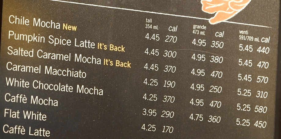 你有想过南瓜肉桂拿铁(Pumpkin Spice Latte)有多少卡路里吗?如果是大杯(Venti)的话,你将摄取470大卡!