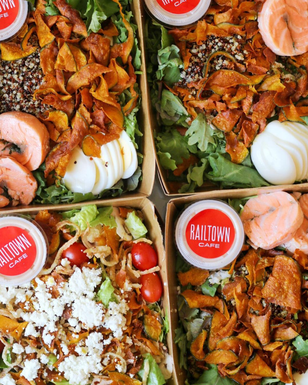 Railtown Café的健康餐食令人印象深刻,两家店的餐食都是店内自制的,有新鲜的三明治、汤和自选沙拉,沙拉吧台让餐厅看起来就健康又便捷。