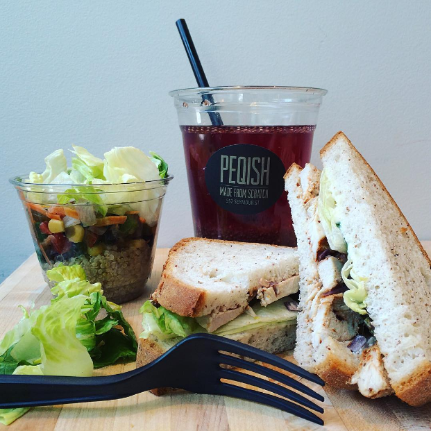 Peqish的所有餐点都是餐厅从头自制的,而且很多都是素食、无奶质和无麸质的。食品包括有早餐手卷、果昔、沙拉、汤、蛋白质餐和各种三明治。