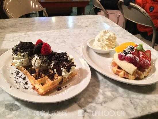 Robson街上一个不太起眼的店面,却有源源不断的客人在逛街之余进门品尝。两种华夫饼的选择:BelgiumWaffle,Liege Waffle,再配上多种水果,奶油,糖浆与巧克力。大大的分量让人满足又甜蜜。