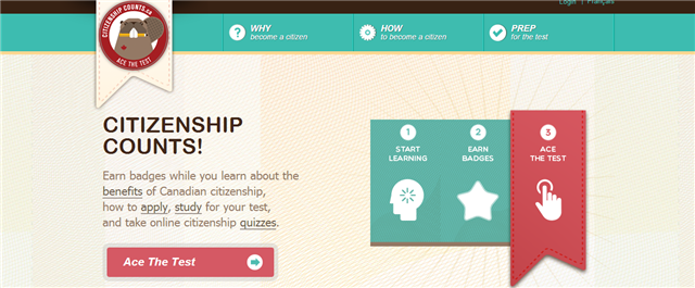 透过使用网站学习,每通过一个与入籍相关的章节,使用者就会获得一个网路奖章,并可以将它分享到社交网站上。